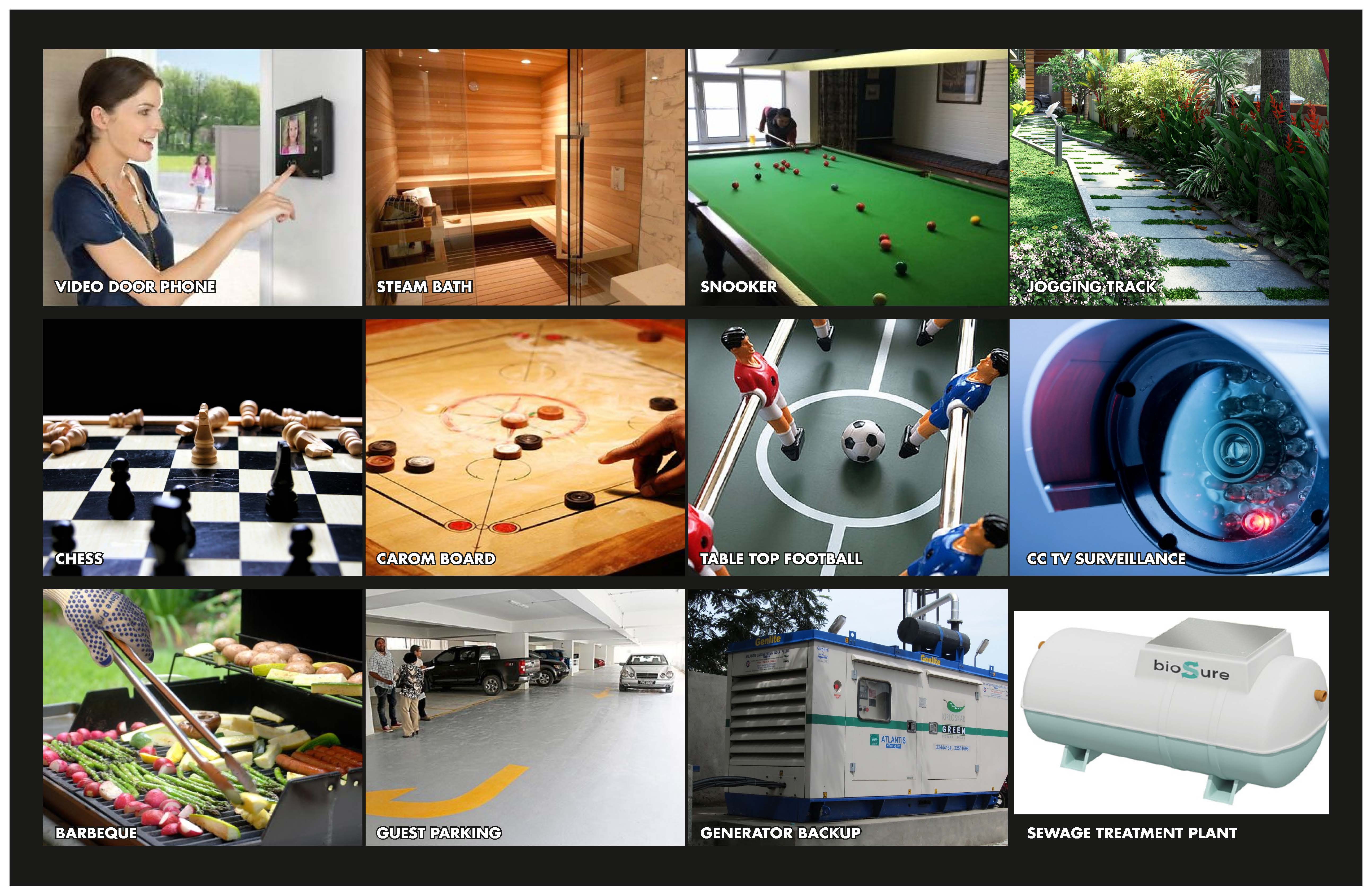 • Amenities : Multipurpose Hall, Fully Equipped Gymnasium with Steam Bath, Indoor Games, Library with Work Space & Children’s Play Area, STP, DG Backup, Video door phone, RO Plant, Solar water heater, Guest car park, CC TV surveillance,